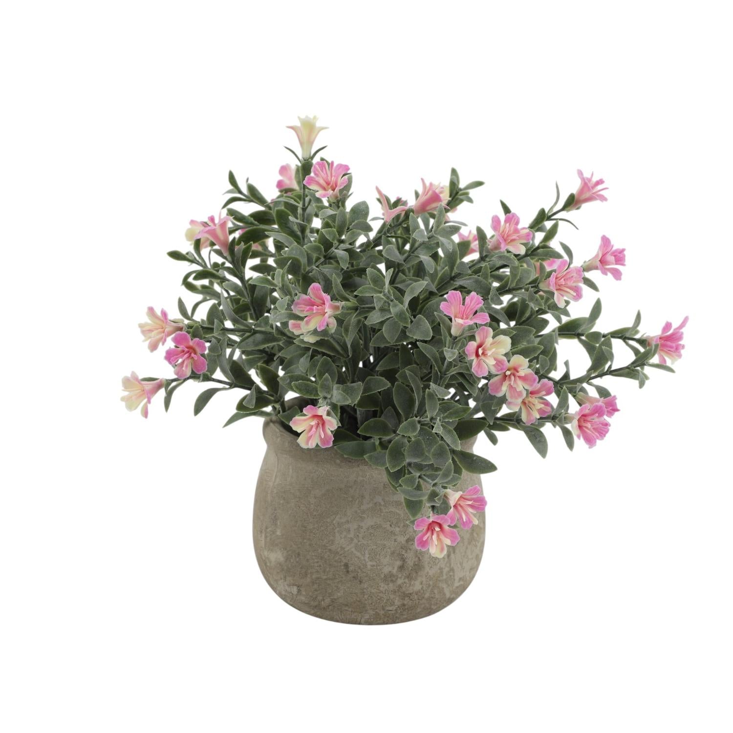 Esta es una planta artificial compacta, ideal para decoración interior en escritorios, estanterías o ventanas. Ofrece la belleza de una planta natural sin necesidad de mantenimiento. Viene en una maceta redonda y texturizada con un acabado rústico. El follaje es abundante y de color verde con una apariencia ligeramente nevada o empolvada. Su tamaño reducido la hace perfecta para crear un punto focal natural en cualquier espacio del hogar u oficina.