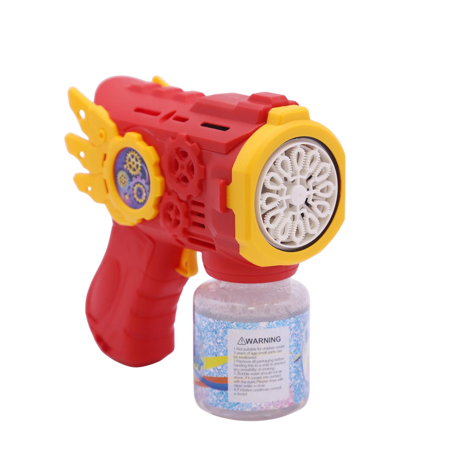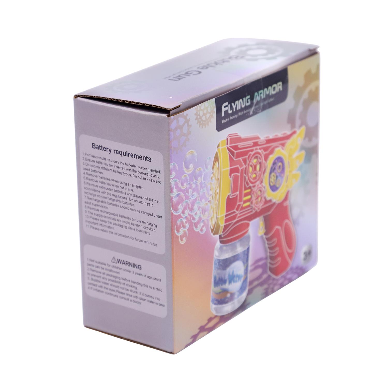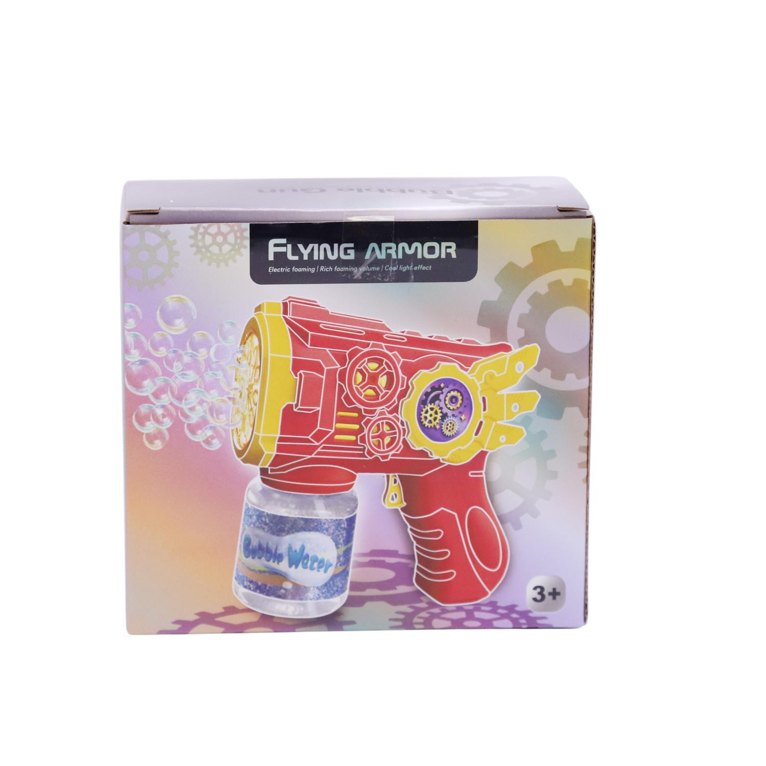 Esta es una moderna pistola lanza burbujas eléctrica diseñada para crear un gran volumen de burbujas de forma continua y automática. Es un juguete divertido y llamativo, ideal para niños mayores de 3 años. Presenta un diseño futurista llamado Flying Armor, con detalles de engranajes y "alas" amarillas en los costados. Funciona con un motor que produce una espuma eléctrica y genera un alto volumen de burbujas. Cuenta con efectos de luz fríos que hacen el juego más atractivo, especialmente de noche.