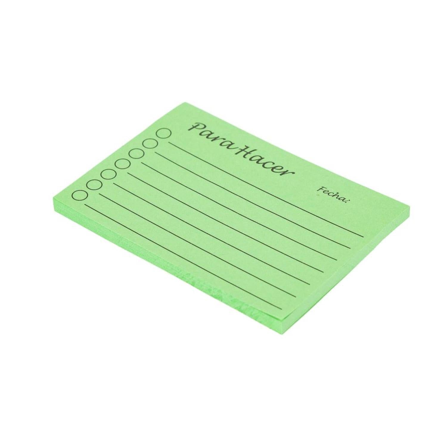 Mantén tus pendientes organizados con estas notas adhesivas "Para Hacer" en colores vibrantes. Su diseño práctico te permite escribir tareas, marcarlas y llevar un control eficiente de tus actividades diarias. Diseño con líneas y casillas de verificación para una mejor organización, adhesivo de alta calidad, fácil de pegar y remover sin dejar residuos. Colores surtidos para clasificar tareas por prioridad o categoría, tamaño compacto, ideal para escritorios, libretas y agendas.Material: Papel Adhesivo RemovibleColor: Verde ClaroDimensiones: 10*7 cmsContenido: 50 PáginasMarca: HomeWell
