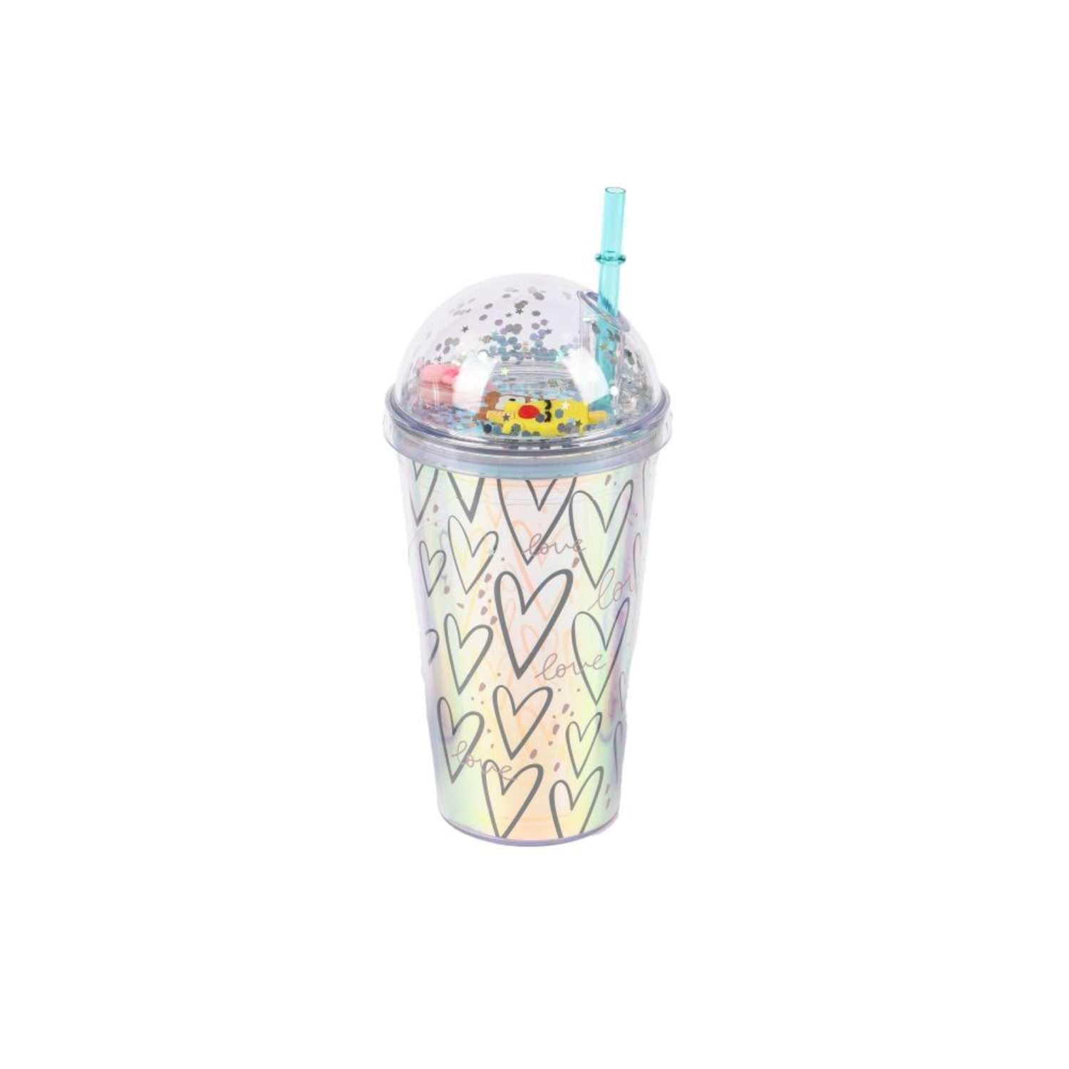 Vaso Bombilla Diseño Corazones Iridiscente 450ml 21x11cm